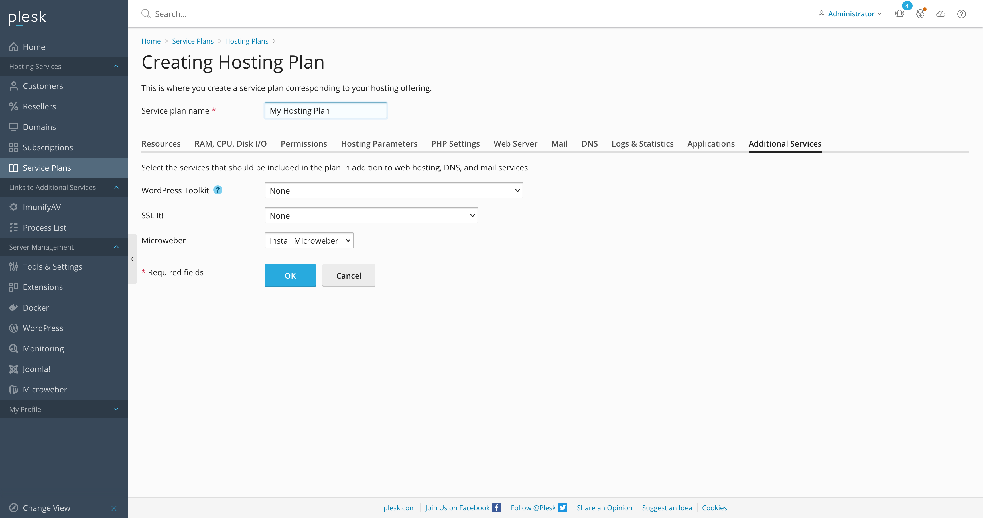 In order to make automatic install when the user creates new domain, you must go to *Home->Service Plans->Hosting Plans* and then click on *Additional Services* and select *Install Microweber* from the dropdown box.