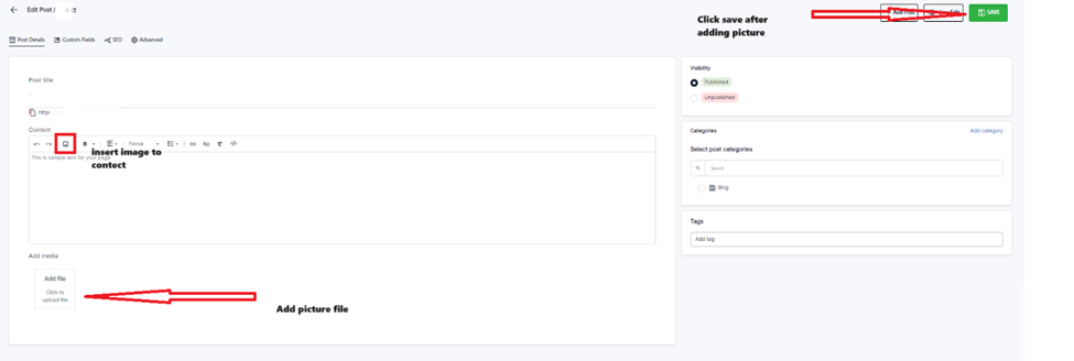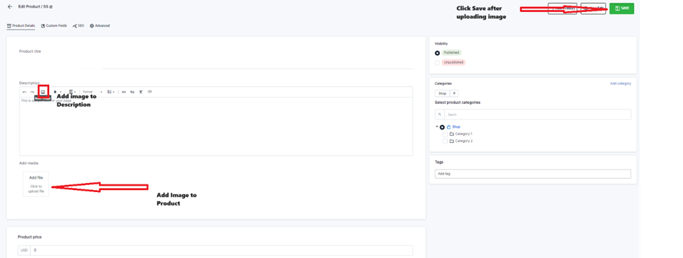 • Then you can either insert image to description if needed or add a media.