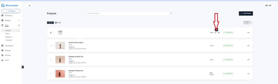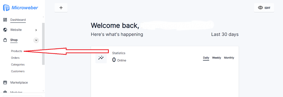 • From the left windows corner Click on “**Shop**”, below list will appear to click on “**Products**”.
