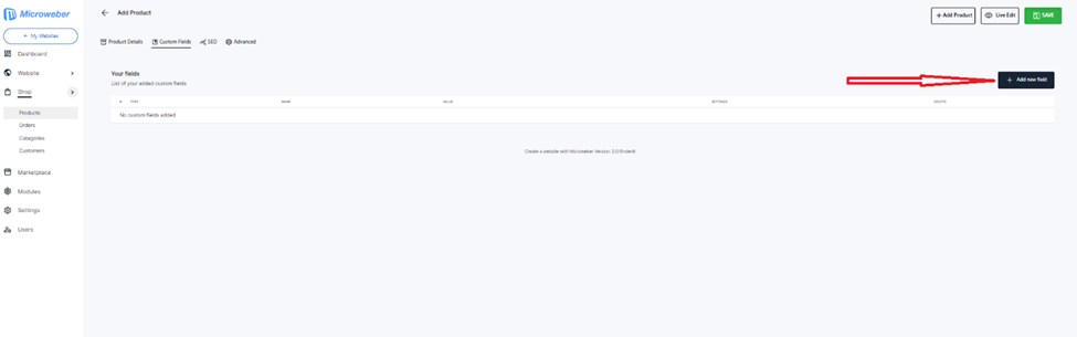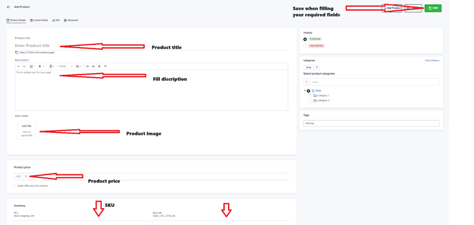 • In product page, you shall fill the required known fields first like name, description then press “**Save**”.