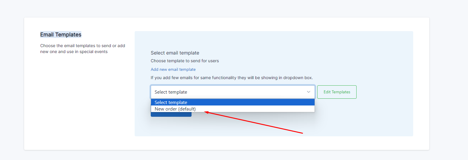 5. You can edit the mail template by choosing the type "new\_order" from the edit templates button\ <br>