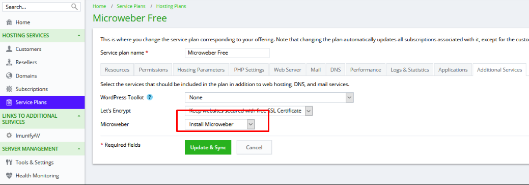**For automatic install**: In order to make automatic install when the user creates new domain, you must go to *Home->Service Plans->Hosting Plans* and then click on *Additional Services* and select *Install Microweber* from the dropdown box.