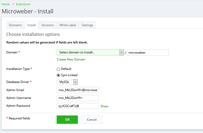 **For manual install**: Click the Microweber icon in the sidebar under *Server management->Microweber* and then click on *Install* and select *Domain* from the dropdown box.